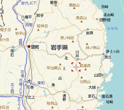 郷土史の専門家で伊達領の新田開発、用水・潜穴<の研究を本にした高倉淳先生とともに小国町の川井堰を訪ねました。左は小国集落を中心とした川井村周辺の地図です。西に早池峰山、南西には遠野市、東に宮古市、南東に釜石市があります。仙台市から高速道路で水沢インターへ行き、そこから江刺市を経て盛街道を走ると遠野市に着きます。この盛街道はお節と喜右衛門が捕縛されて仙台に護送されたときに通ったと考えられる古い街道です。遠野から小国は山の中、北方へ山の中を走り、峠を越えると小国です。